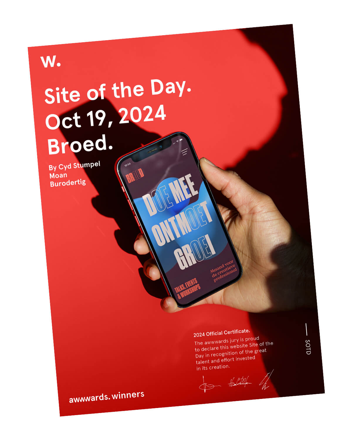 De website viel in de prijzen en werd door o.a. Awwwards bekroond tot Site of the Day! Een mooie erkenning van onze vakgenoten, die zowel het design als de functionaliteit van de site wisten te waarderen. Cyd Stumpel, de developer van de website van BROED mocht daarnaast ook de Developer Award in ontvangst nemen.